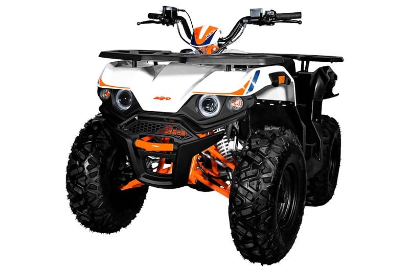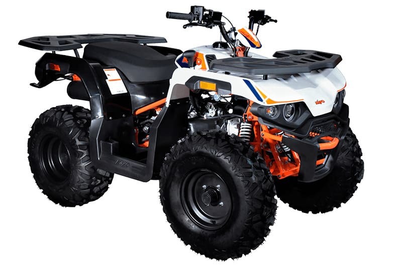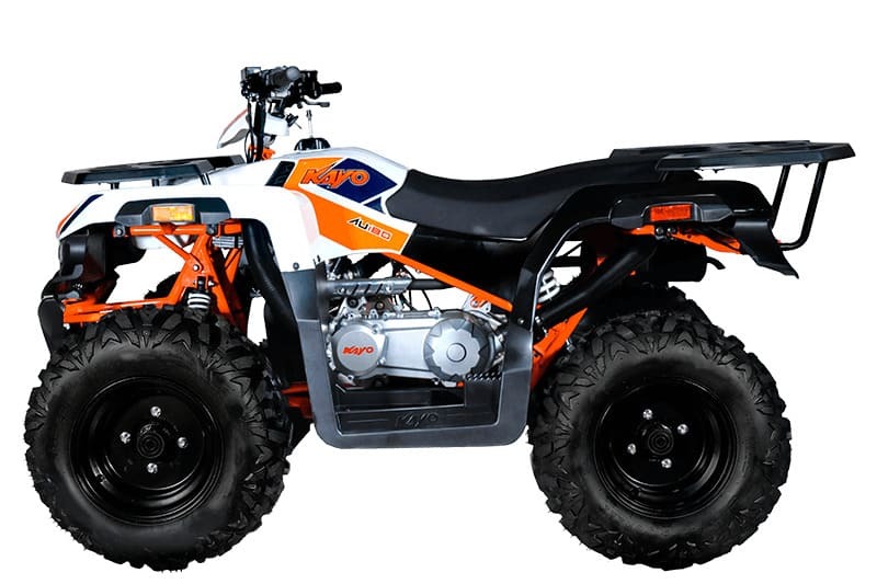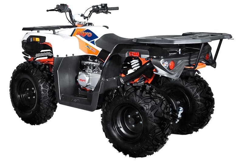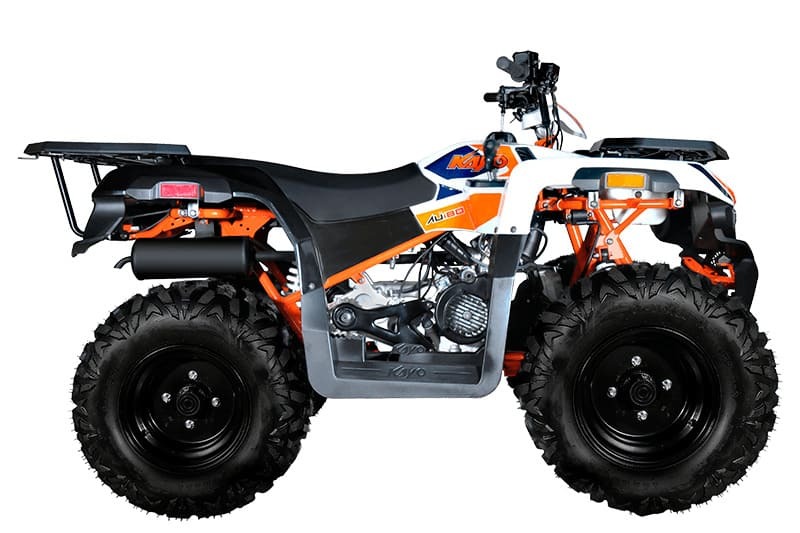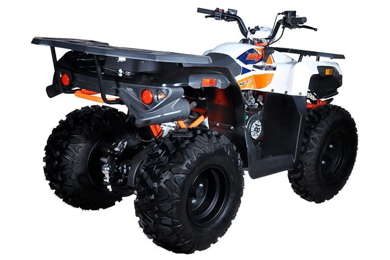 KAYO AU180 также комплектуется производительными дисковыми гидравлическими тормозами, качественным световым оборудованием для использования техники при недостаточном освещении, передней и задней багажными площадками для перевозки небольших грузов, а также фаркопом для прицепа.