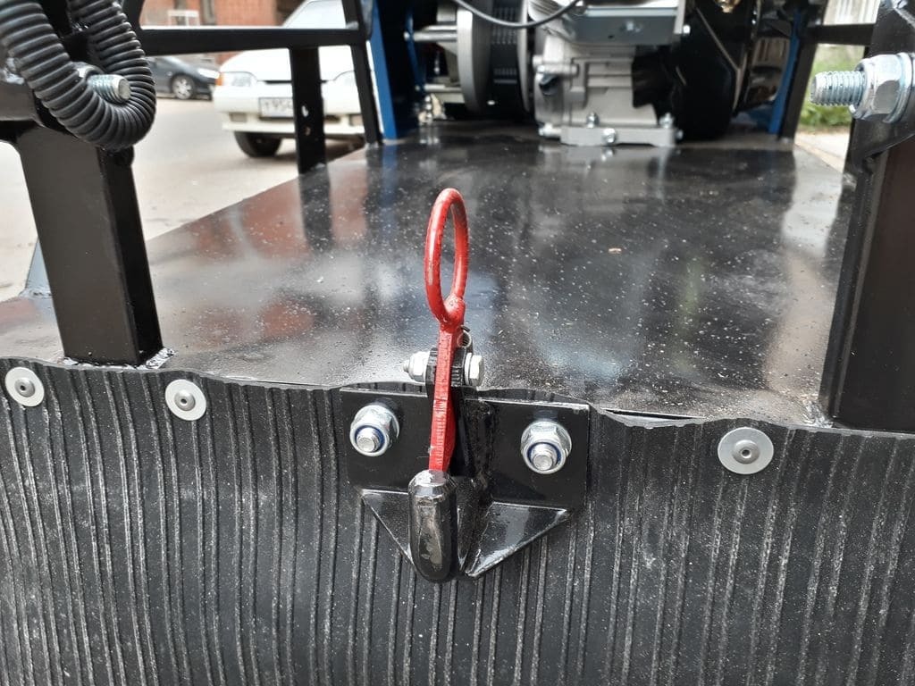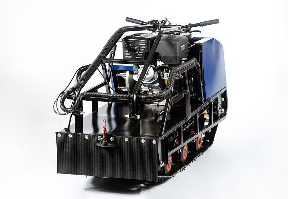 Увеличенный угол атаки позволяет с легкостью преодолевать глубокие снежные заносы. На ведущем валу мотобуксировщика установлены самоцентрующие подшипники. Смазка подшипника производиться без разборки ведущего вала и снят. Крепление руля вынесено выше платформы, что значительно повышает управляемость мотобуксировщика. Ширина руля средняя, что облегчает управление мотобуксировщиком в болоте и лесу. На мотобуксировщике установлен фаркоп. Это упрощает процесс крепления саней к мотобуксировщику, в отличии от стандартных прицепных устройств, где используется обычный рымбол.