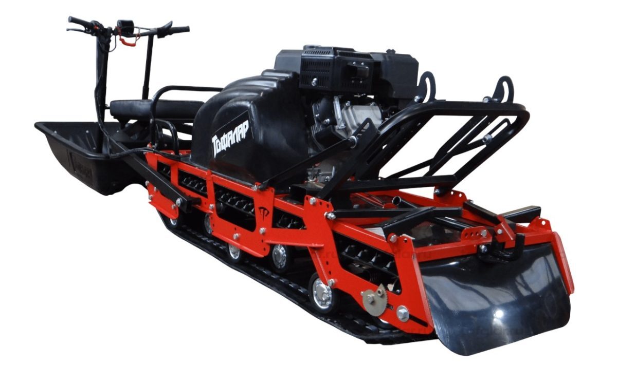 В конструкции мотовездехода используется цельная резиновая гусеница шириной 500 мм. Гусеница в сочетании с катковой подвеской способна проходить спокойно по льду и даже по территории без снега.