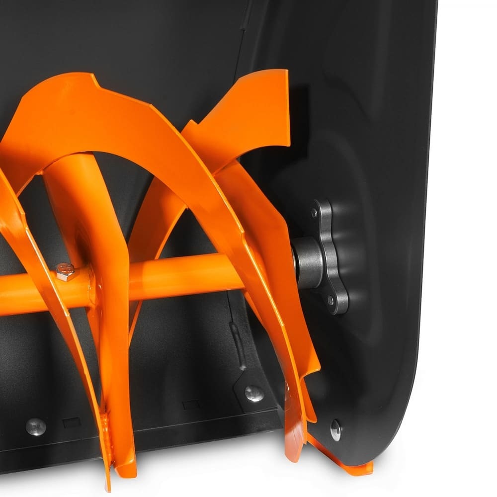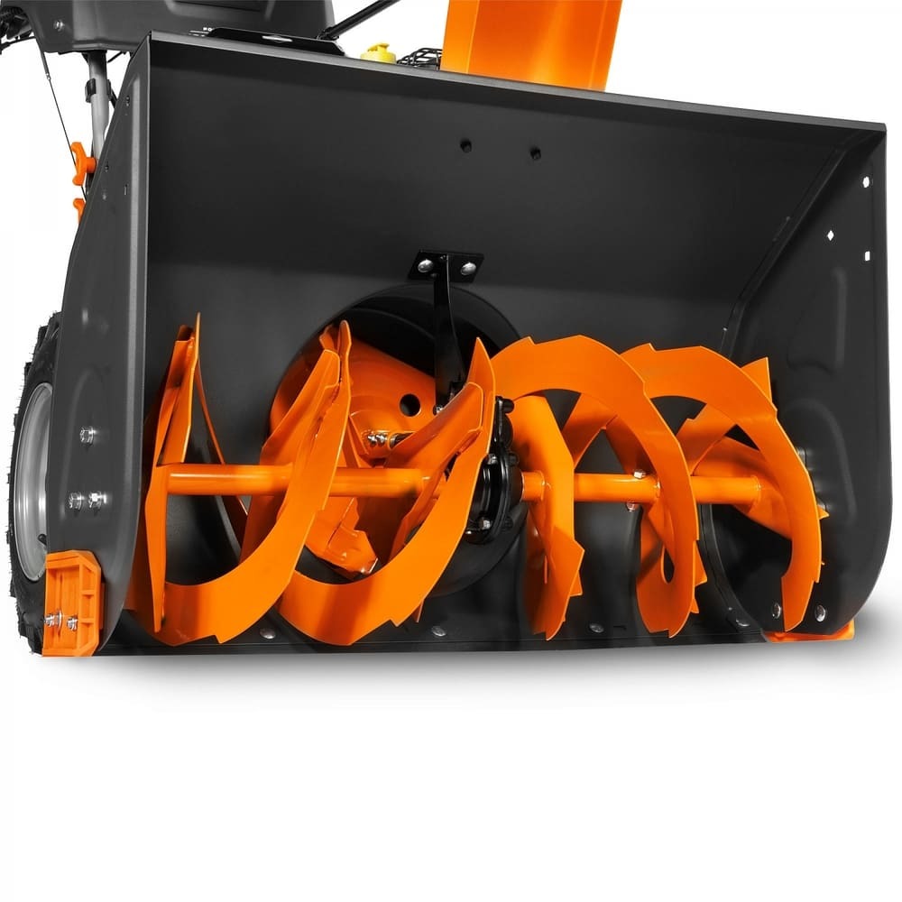 Снегоуборочная машина оснащена бензиновым двигателем Briggs&Stratton мощностью 10 л.с. и объемом 306 куб. см с воздушным охлаждением. Запуск мотора можно производить как с ручного стартера, так и с электростартера, максимальных оборотов двигатель достигает 3600.
