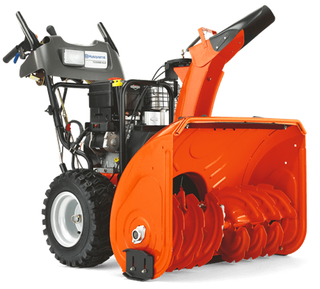 Двухступенчатая система. Снег подается под кожух шнеком и затем выбрасывается крыльчаткой через раструб.